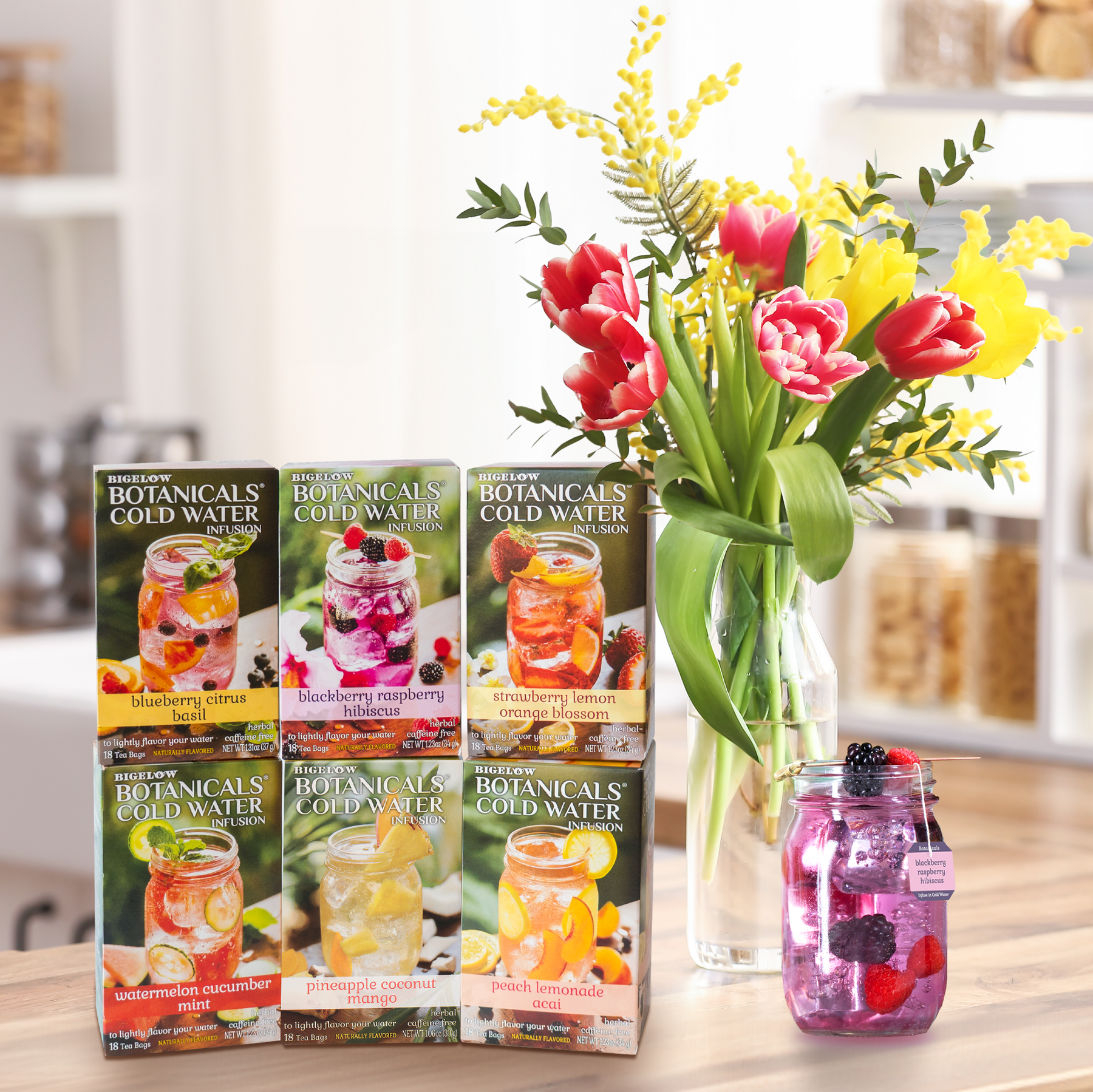 Botanicals Cold Water drink mix boxes with a vase of flowers and a jar on a kitchen counter.